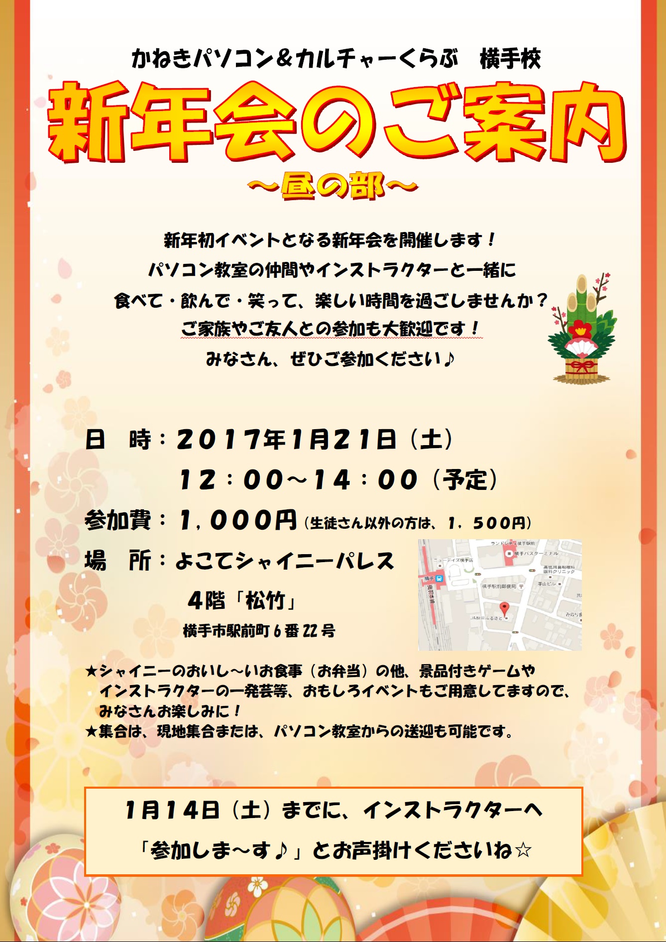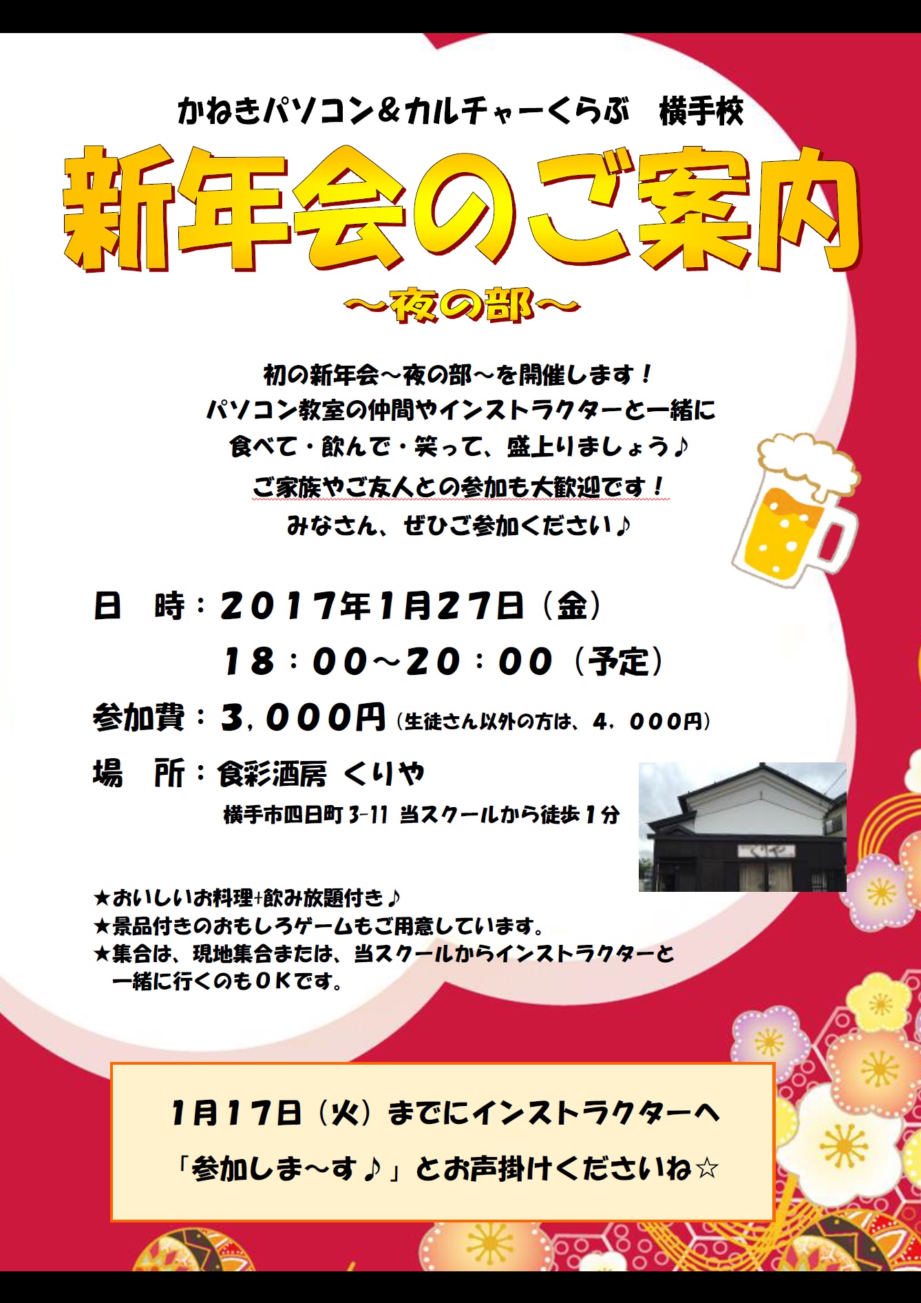 昨年、たくさんの方にご参加いただいた当スクールの新年会ですが、今年も開催が決定しました![]()